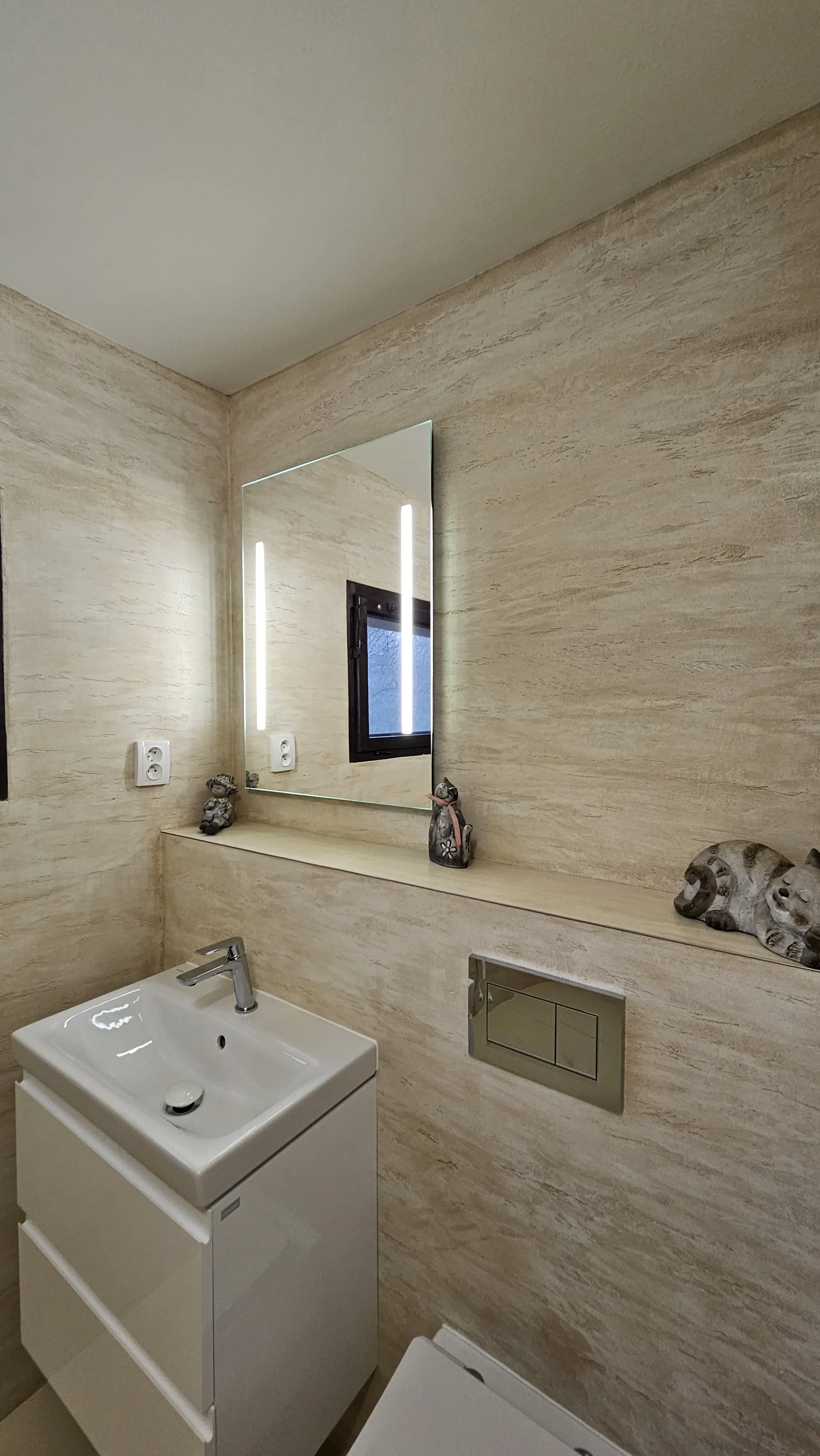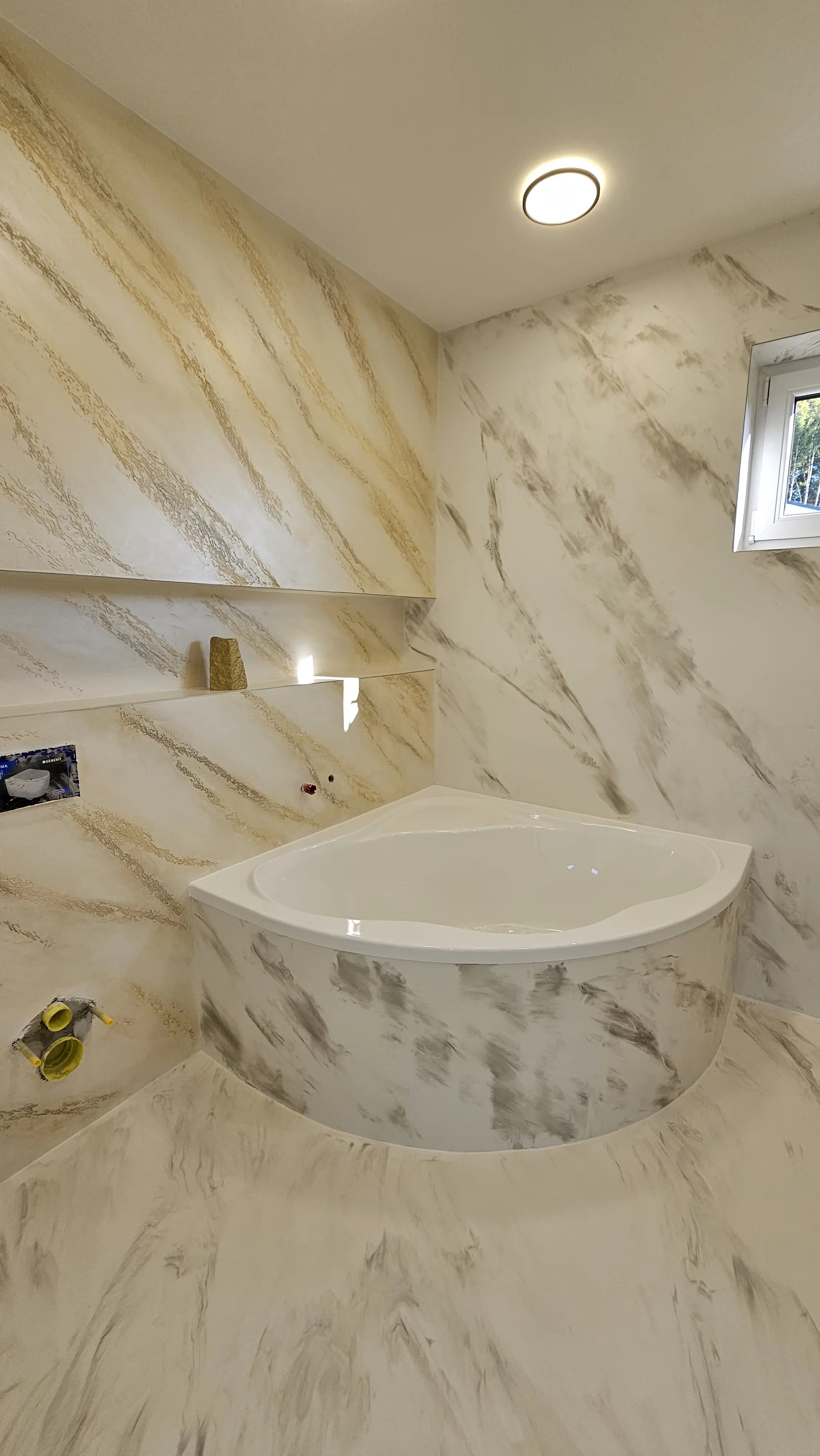 Dekorativní stěrka ve světlém tónu s jemným mramorovým efektem vytváří klidný a elegantní povrch koupelny. Nepravidelné žilkování dodává stěnám přirozenou hloubku. Nadčasové řešení pro koupelny s důrazem na čistý design.
