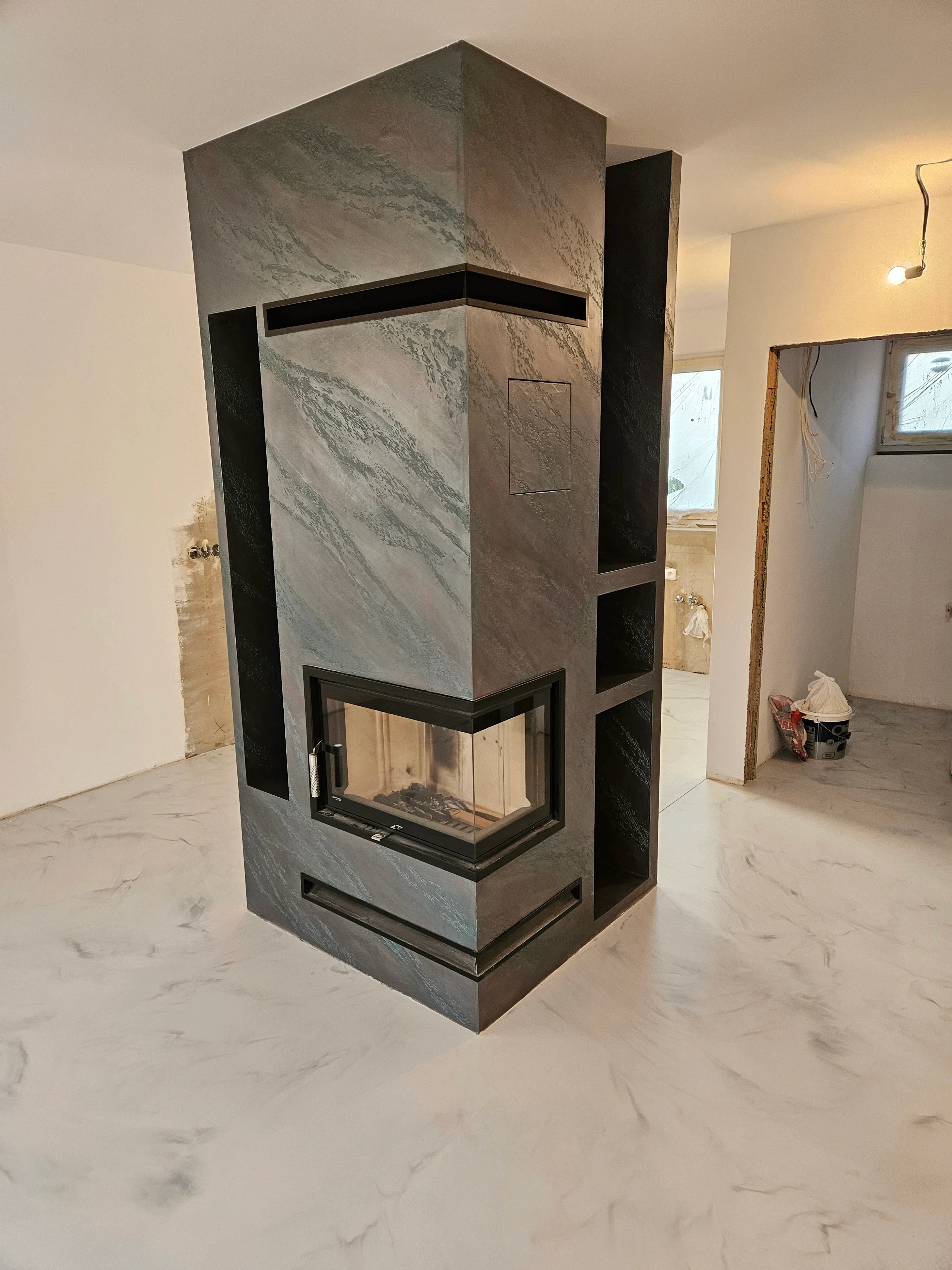 Dekorativní stěrka v tmavších šedých a antracitových tónech dodává krbu výrazný architektonický charakter. Jemná struktura zvýrazňuje linie i detaily a pracuje se světlem. Dominantní prvek moderního interiéru.
