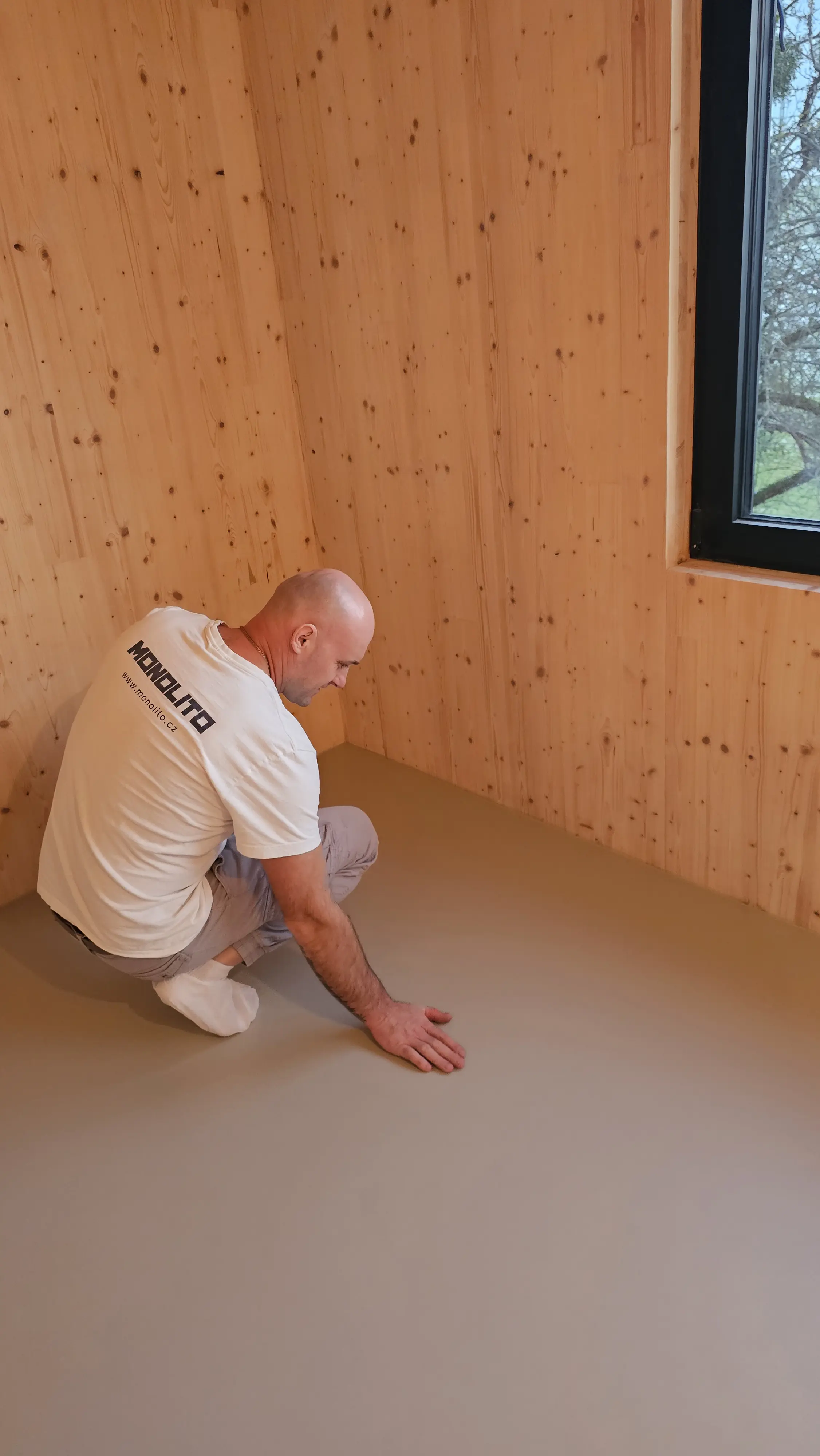 Světlá bezespará podlaha v teplém přírodním odstínu vytváří klidný základ interiéru. Hladký matný povrch je příjemný na došlap a přirozeně ladí s dřevěnými stěnami. Ideální řešení pro moderní útulné prostory.
